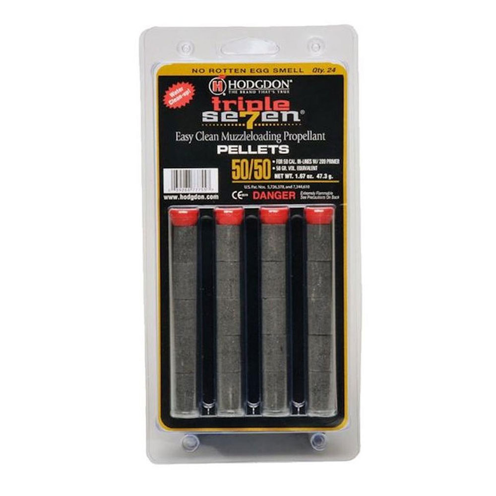 Triple Seven 50/50 pellets are 50-caliber, 50-grain pellets designed for use in 50-caliber, in-line rifles. A single pellet may be used for target or small game and two pellets may be used to create the 100 gr. equivalent for big game.